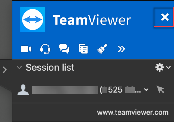 4. Yhteys on nyt muodostettu ja Visman asiantuntija näkee tietokoneesi ruudun. Voit katkaista yhteyden milloin tahansa klikkaamalla TeamViewer -kuvakkeesta X-painiketta, joka sulkee TeamViewer ikkunan ja katkaisee yhteyden.